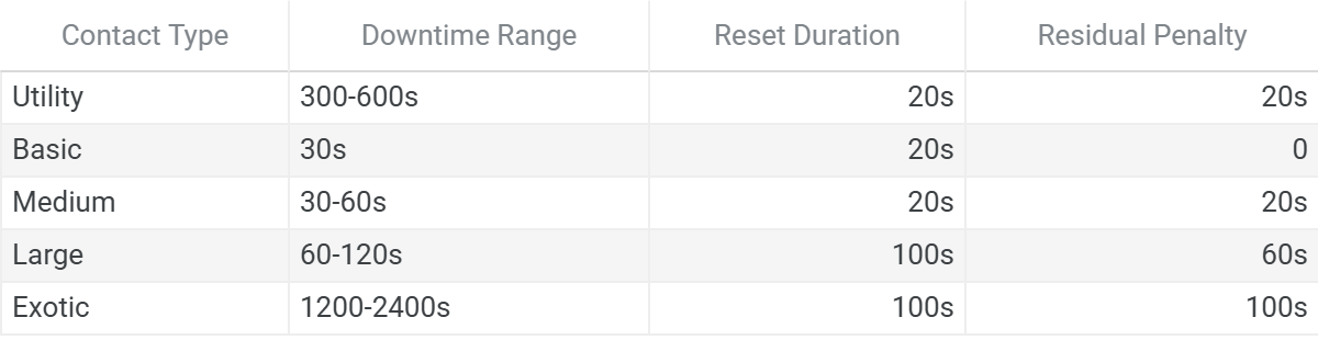 Reset cost is partially offset by contact downtime—the interval between contact de-spawn and next spawn during which no acquisition is possible. The realized penalty depends on the downtime range for each contact type and whether waiting until the end of the downtime window produces a net benefit.