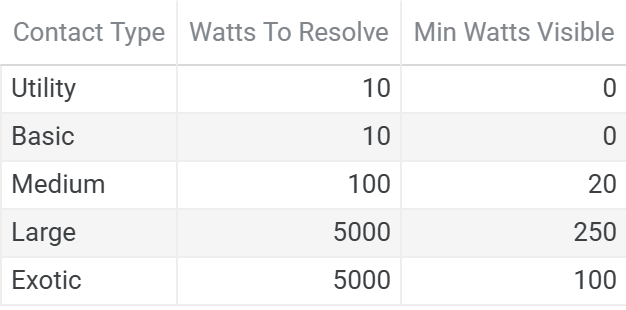 Contact Visibility requires delivered power to meet a minimum threshold. Contacts below threshold do not appear regardless of pointing accuracy: