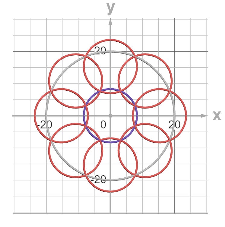 Refine samples nine positions: the detection origin from Scan and eight equally spaced points arranged in a ring equidistant from the detection origin. Each outer circle is sized to span from the detection origin circle to the search boundary, intersecting both at the bisector angles between adjacent circles — at 22.5° and 67.5° intervals. This constrains the detection radius to 8.28°.