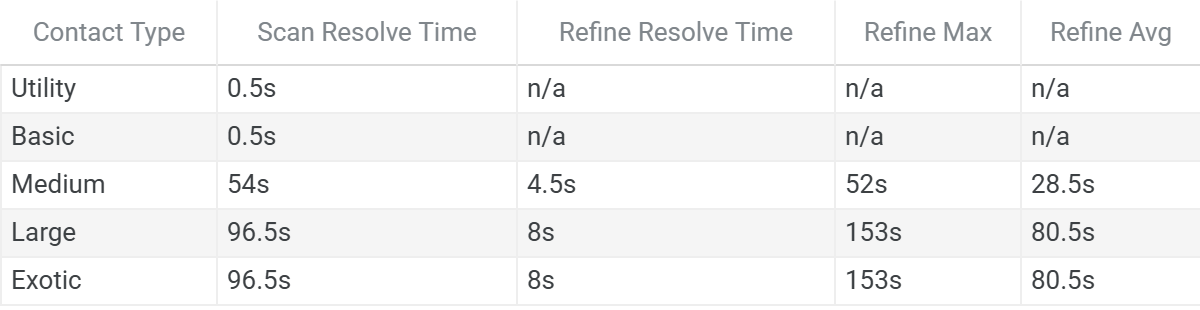 For Medium contacts, worst-case Refine time (52s) is comparable to the scan resolve time (54s), making the benefit marginal on a per-phase basis. For Large and Exotic contacts, worst-case Refine time (153s) exceeds the Scan resolve time (96.5s) — Refine is potentially slower than simply dwelling at the scan detection position.