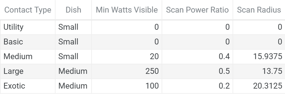 Utility, Basic, and Medium contacts can be acquired using the small dish. Large and Exotic contacts have a lifetime of 1800-1860s, exceeding the small dish capability by more than a factor of three, and therefore, require at least a medium dish.