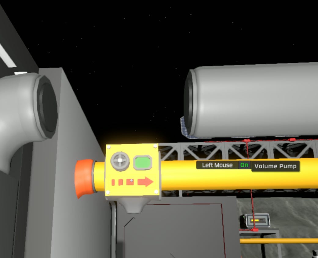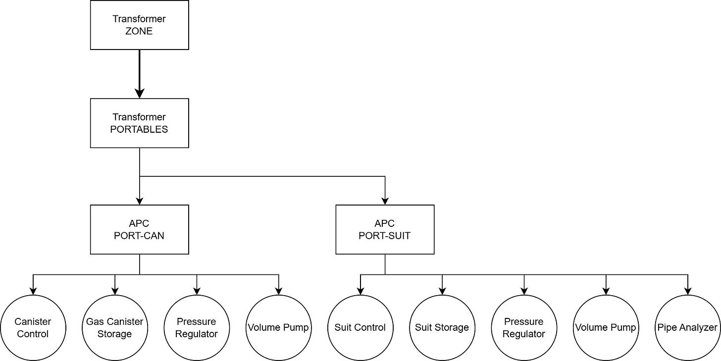 The exhaust system uses a two-stage approach, similarly seen in Life Support I: Base Pressure and Composition: rapid internal evacuation to a buffer tank, followed by controlled external evacuation to the ECL (Exhaust Capture Line). This protects vulnerable walls and surfaces from burst events while maintaining efficient suit processing.