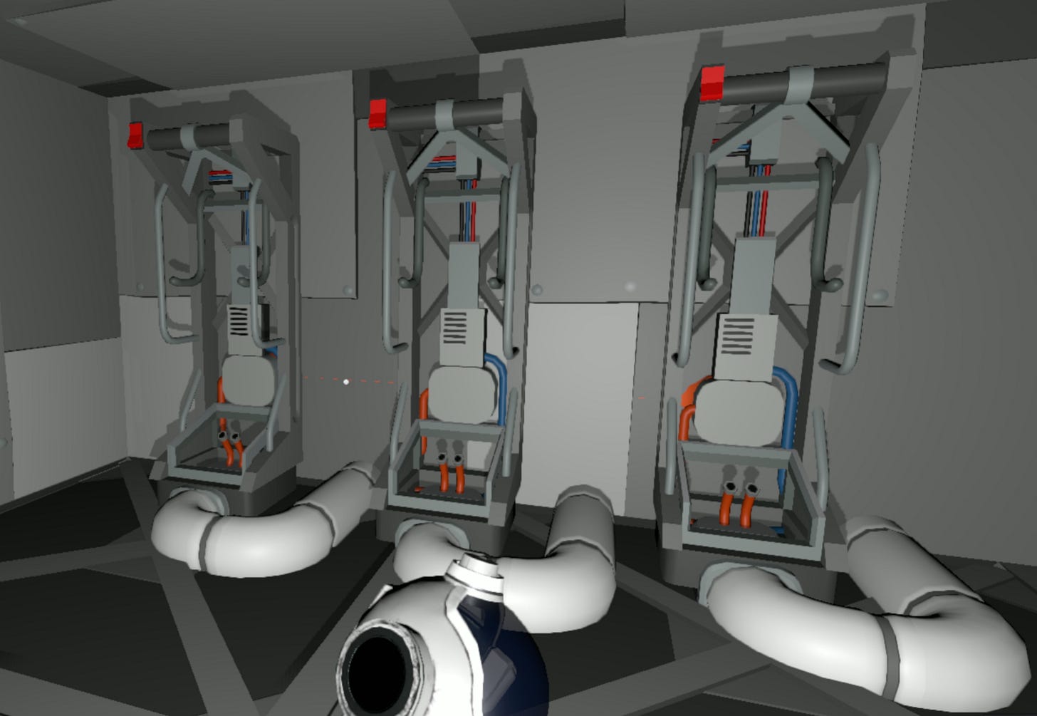Along the interior wall, install suit storages so that the nitrogen and exhaust pipes connect directly to the back of each unit. Snake the oxygen pipe so that it connects to the front port.