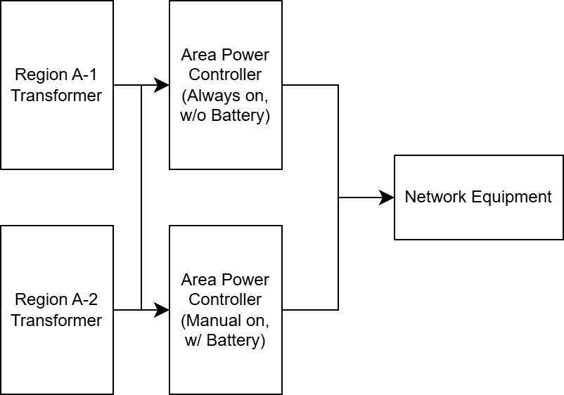 Equipment at regional boundaries connect to both regions simultaneously, drawing power from whichever region is available. Bypass doors and airlocks maintain this dual-feed configuration to prevent isolation scenarios where a single region failure might trap operators or block emergency egress.
