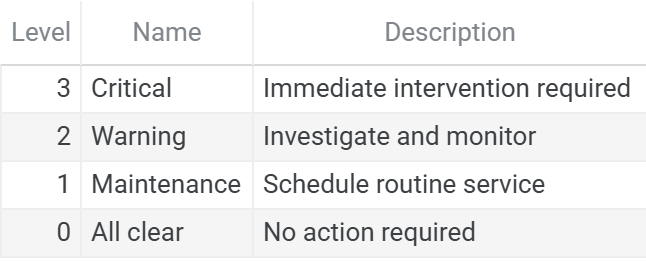 Severity — Urgency level (0-3): All Clear, Maintenance, Warning, Critical