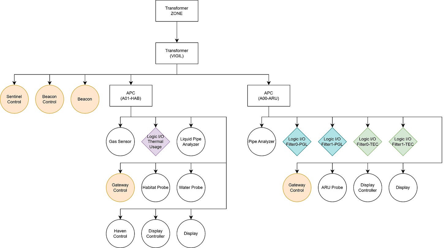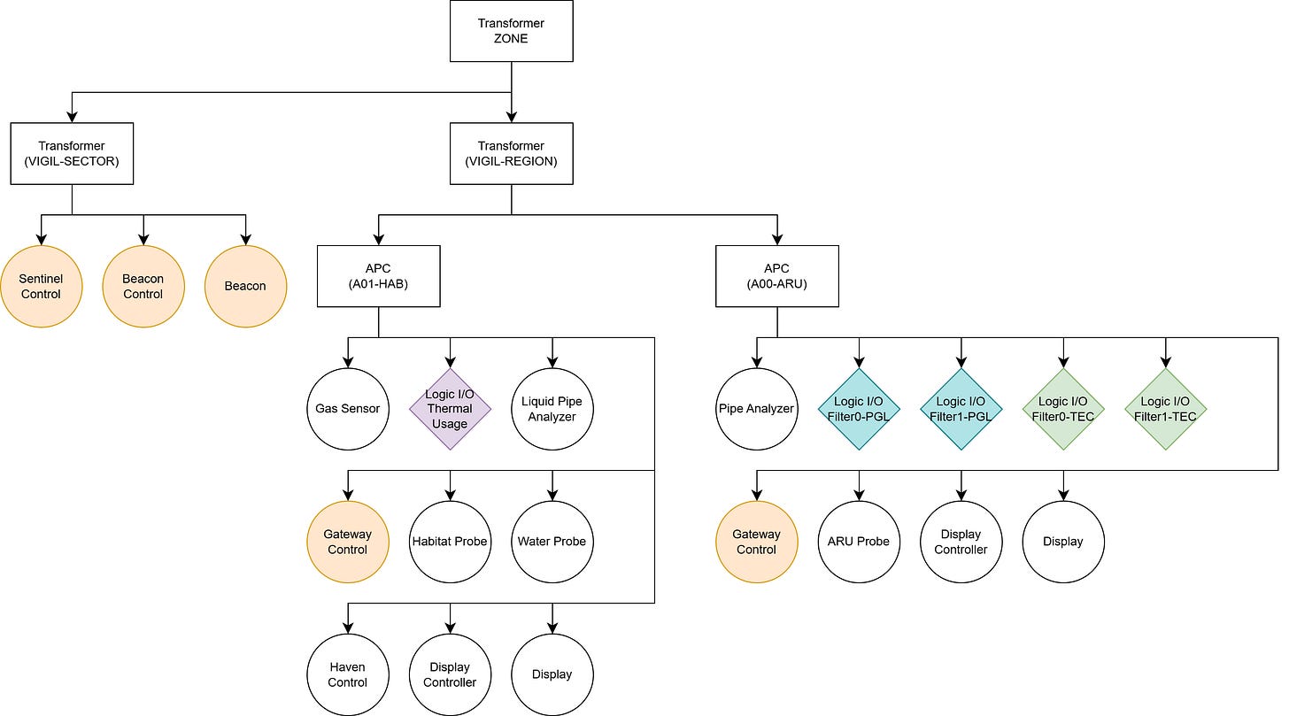 Location — A monitoring boundary defined by network isolation. Locations may be interior spaces (habitat modules, processing rooms) or exterior installations (solar arrays, mining sites). Location identifiers use 4-digit format SSRR (Sector + Room), e.g., Location 0102 = Sector 01, Room 02.
