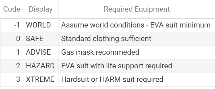 Code 0 (SAFE): Breathable atmosphere within comfortable temperature range, no contamination. Standard clothing sufficient.