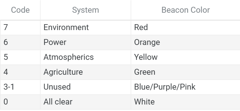 Beacon state changes occur during the OFF phase of the pulse cycle. This prevents intermediate flicker or color mixing during transitions, ensuring operators always see a clear, unambiguous signal. A beacon transitioning from Warning Power (0.5 Hz orange) to Critical Environment (1 Hz red) will complete its current OFF phase before switching to the new color and pulse rate.