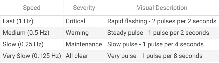 Faster pulse rates indicate higher urgency. Pulsing operation (50% duty cycle across all severity levels) reduces beacon power consumption to 150 W compared to 300 W for continuous operation, while maintaining visible confirmation that the monitoring system is active.